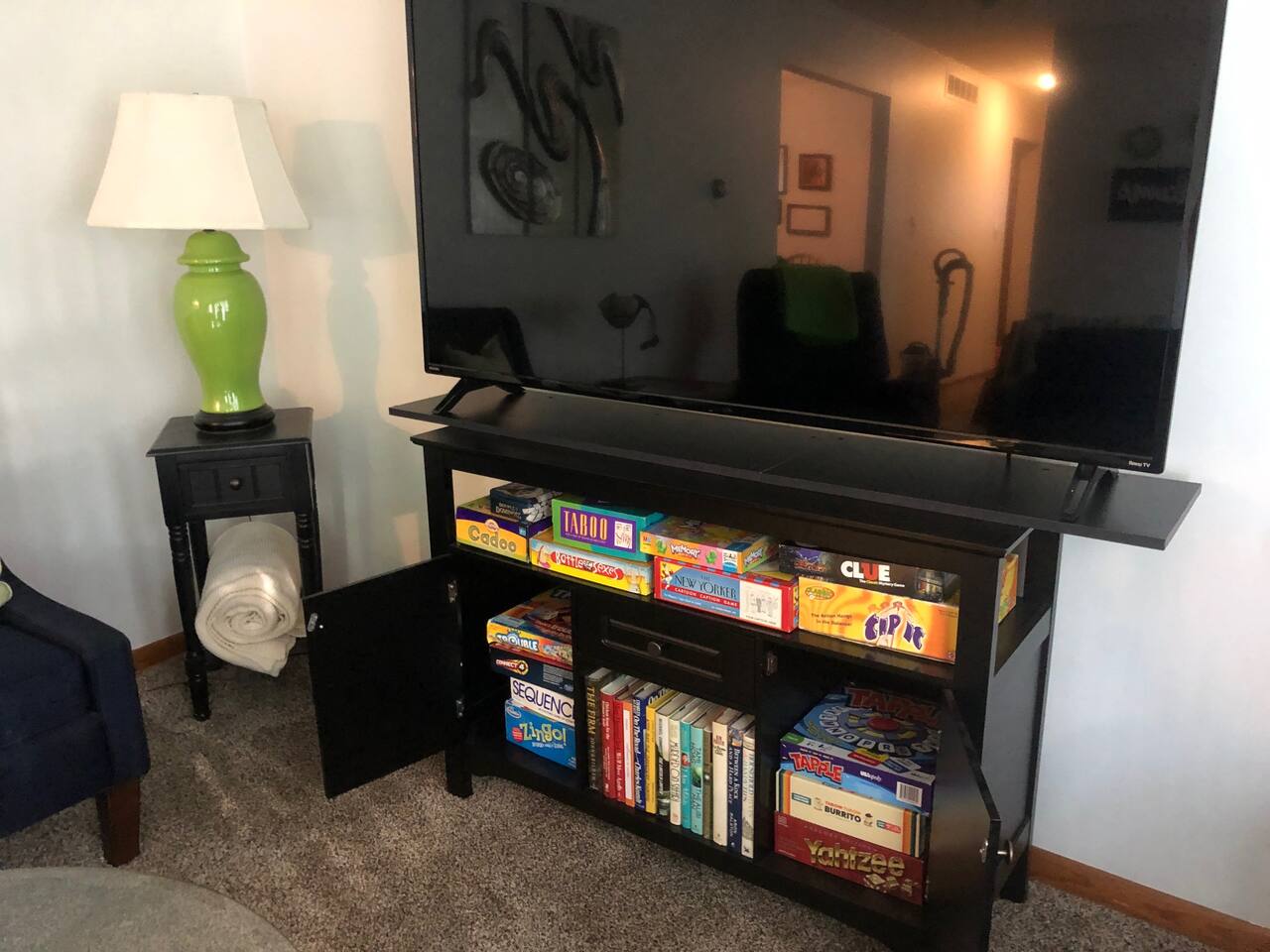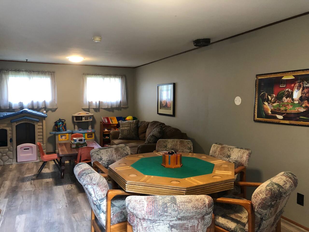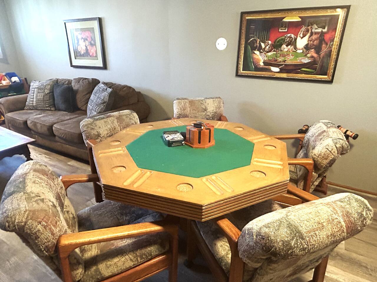 65” smart TV in living room, smaller TV in primary bedroom Variety of books & games Dining table seats 8, Fully equipped kitchen with microwave, dishwasher, Mr Coffee Play room with kids toys and bumper pool table that converts to poker table Basement laundry and 2nd full bath with 4 ft shower